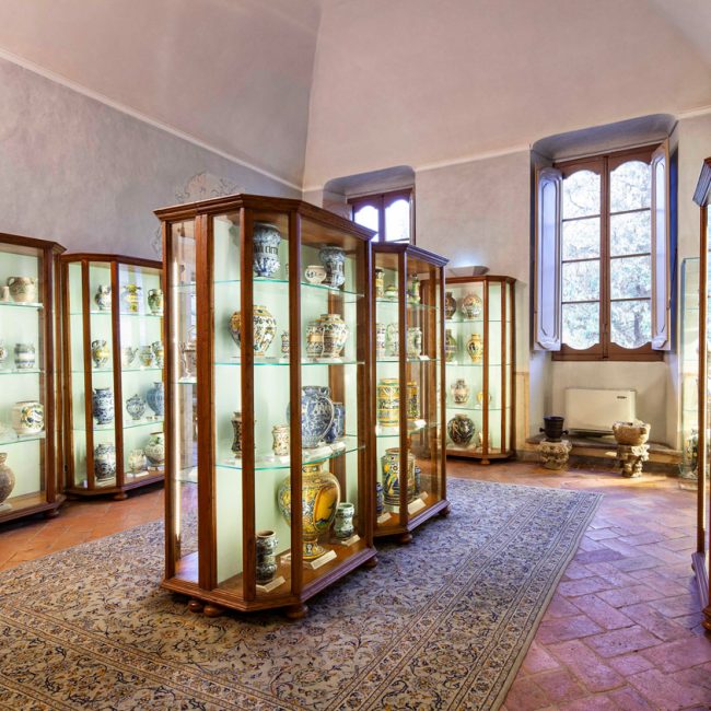 The eye soon becomes accustomed to the bright colours of the various vessels that enrich the displays: albarelli, jugs, cake stands and tankards.