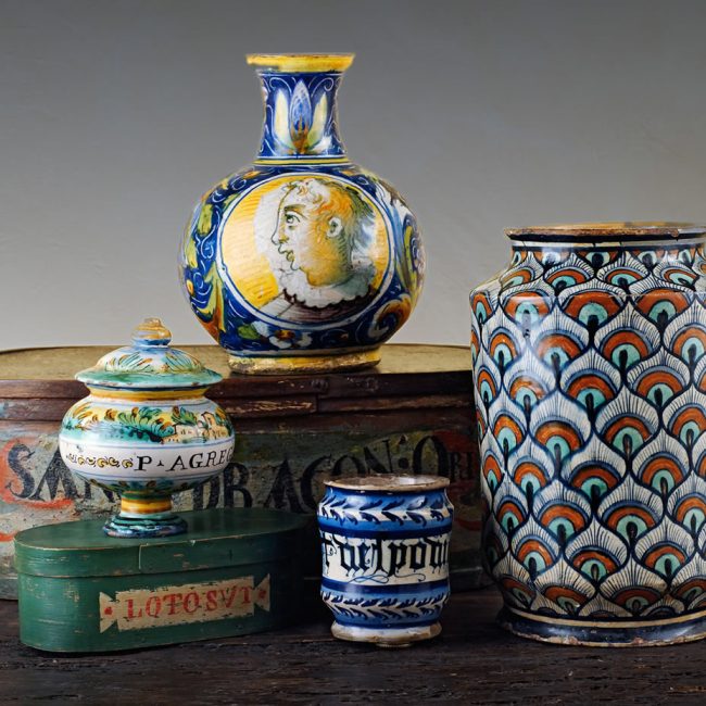 Pottery therefore represented the perfect material from a technical and artistic perspective: impermeable thanks to the vitrification process and light thanks to the tin oxide that made the decoration on the surface stand out to remarkable artistic effect.