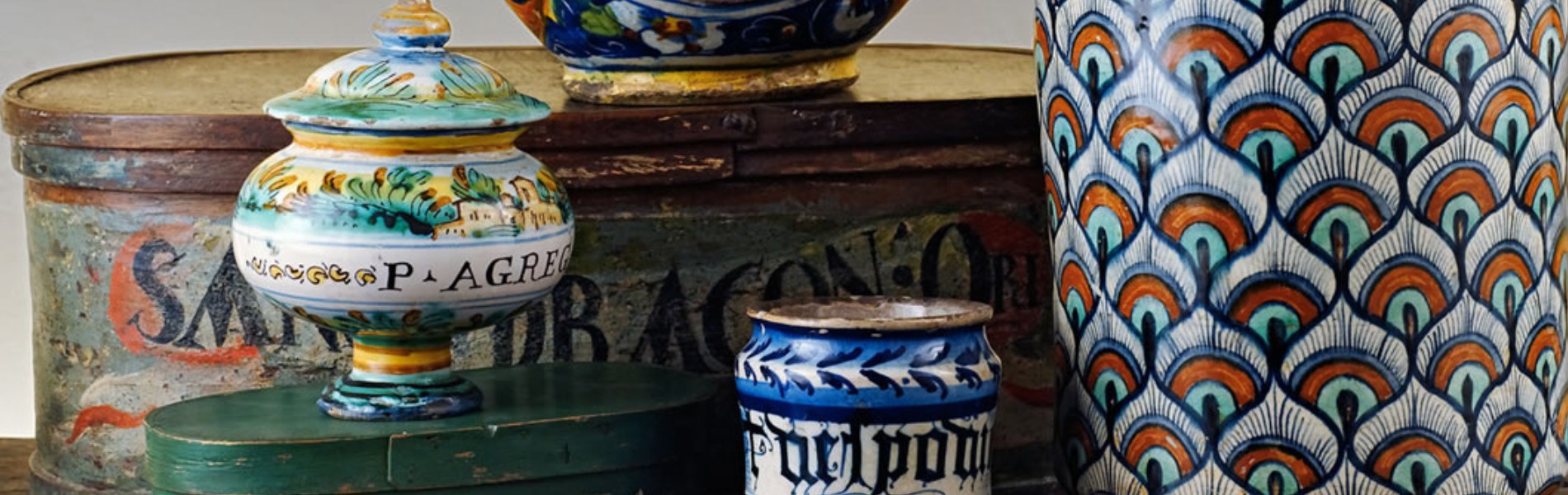 Different kinds of medicinal receptacle: artistically decorated jugs, vases, albarelli, tankards and bottles