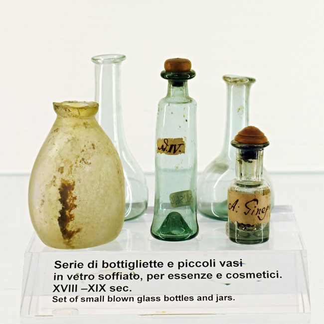 Il vetro, materiale facilmente modellabile, si è sempre prestato per realizzare le dotazioni della farmacia, compresi numerosi strumenti per il laboratorio