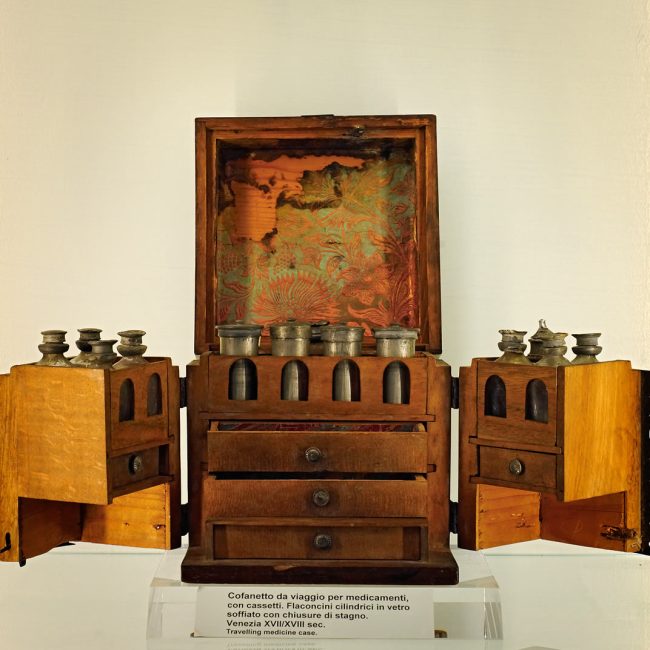 Inoltre, si può osservare una collezione di rare farmacie da viaggio, che venivano usate da medici e speziali per trasportare i preziosi medicamenti.