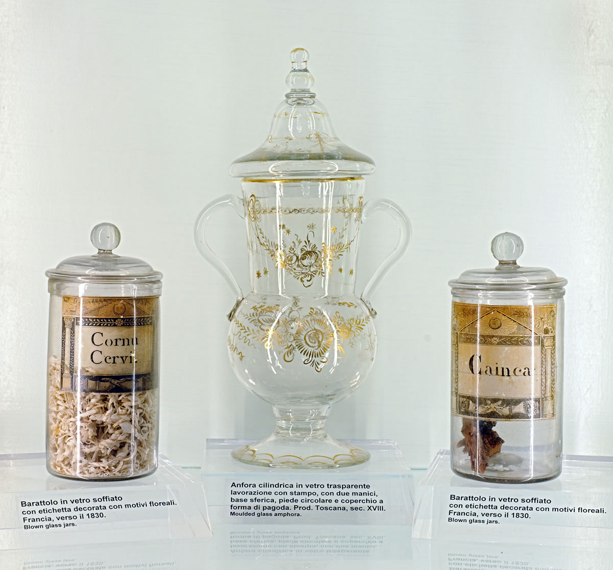 Il vetro, materiale facilmente modellabile, si è sempre prestato per realizzare le dotazioni della farmacia, compresi numerosi strumenti per il laboratorio