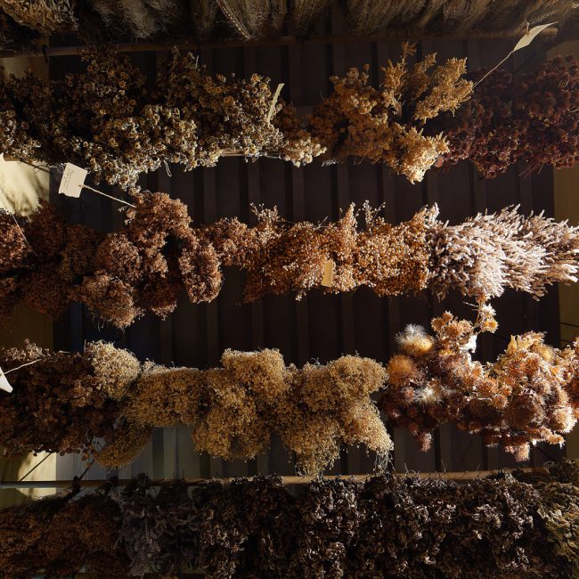 Una numerosa serie di piante medicinali, composte in mazzi ed appese ad essiccare, rendono il soffitto un variopinto e profumato tappeto erboso