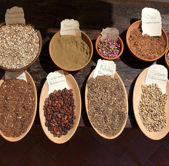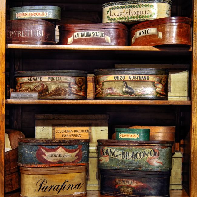 Appese in ambienti asciutti e arieggiati, al riparo dalla luce diretta del sole, le erbe venivano fatte essiccare e subivano i cambiamenti che le preparavano ad essere ridotte in prodotti medicinali. Le erbe venivano poi conservate in appositi contenitori come cesti di vimini e preziose scatole in legno, finemente decorate con cartigli riportanti il nome della pianta.
