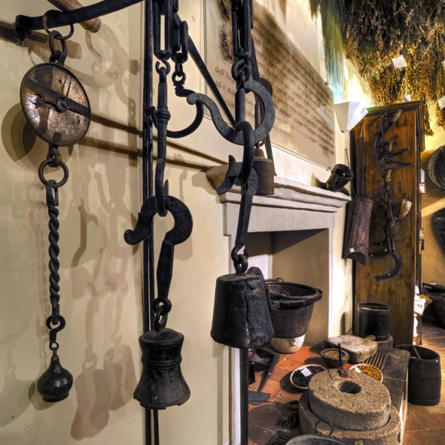 Si accede poi all’ambiente più suggestivo di tutto il museo, la stanza delle erbe. Una corposa serie di mazzi di piante medicinali appese a essiccare rende il soffitto un variopinto e profumato tappeto erboso.