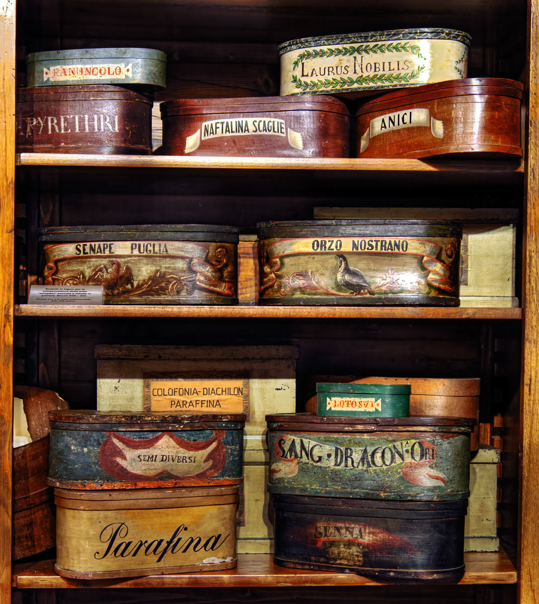 Appese in ambienti asciutti e arieggiati, al riparo dalla luce diretta del sole, le erbe venivano fatte essiccare e subivano i cambiamenti che le preparavano ad essere ridotte in prodotti medicinali. Le erbe venivano poi conservate in appositi contenitori come cesti di vimini e preziose scatole in legno, finemente decorate con cartigli riportanti il nome della pianta.