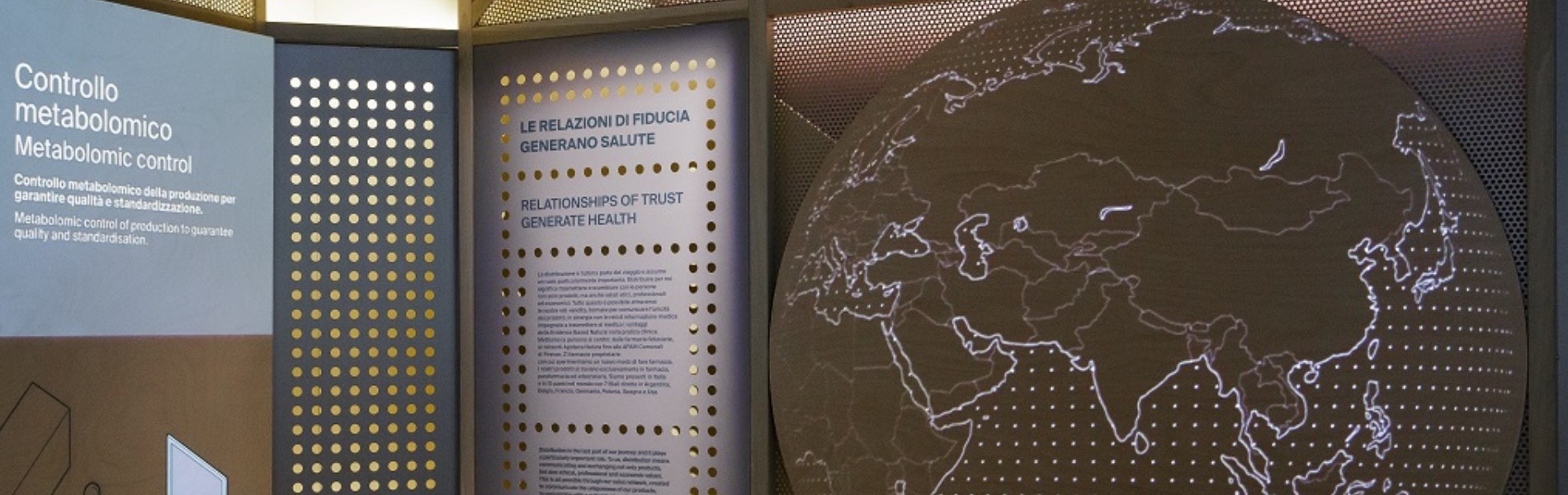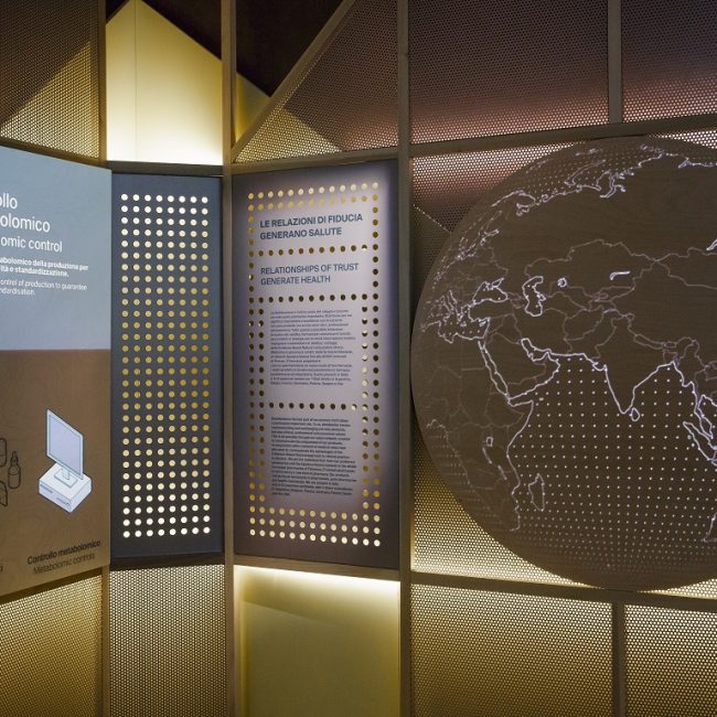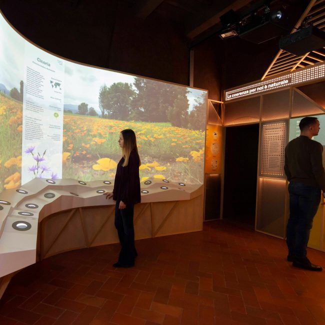 Lasciatevi trasportare dalle enormi proiezioni immersive: avvolti dalle coltivazioni impariamo il valore della biodiversità e le innumerevoli possibilità che la natura ci offre. Con una grafica animata, resa interattiva al tocco del visitatore, esploriamo il ciclo produttivo pensato per ottenere prodotti naturali al 100%, fisiologicamente affini con l’organismo. Un’installazione video descrive la filiera di distribuzione in Italia e all’estero.