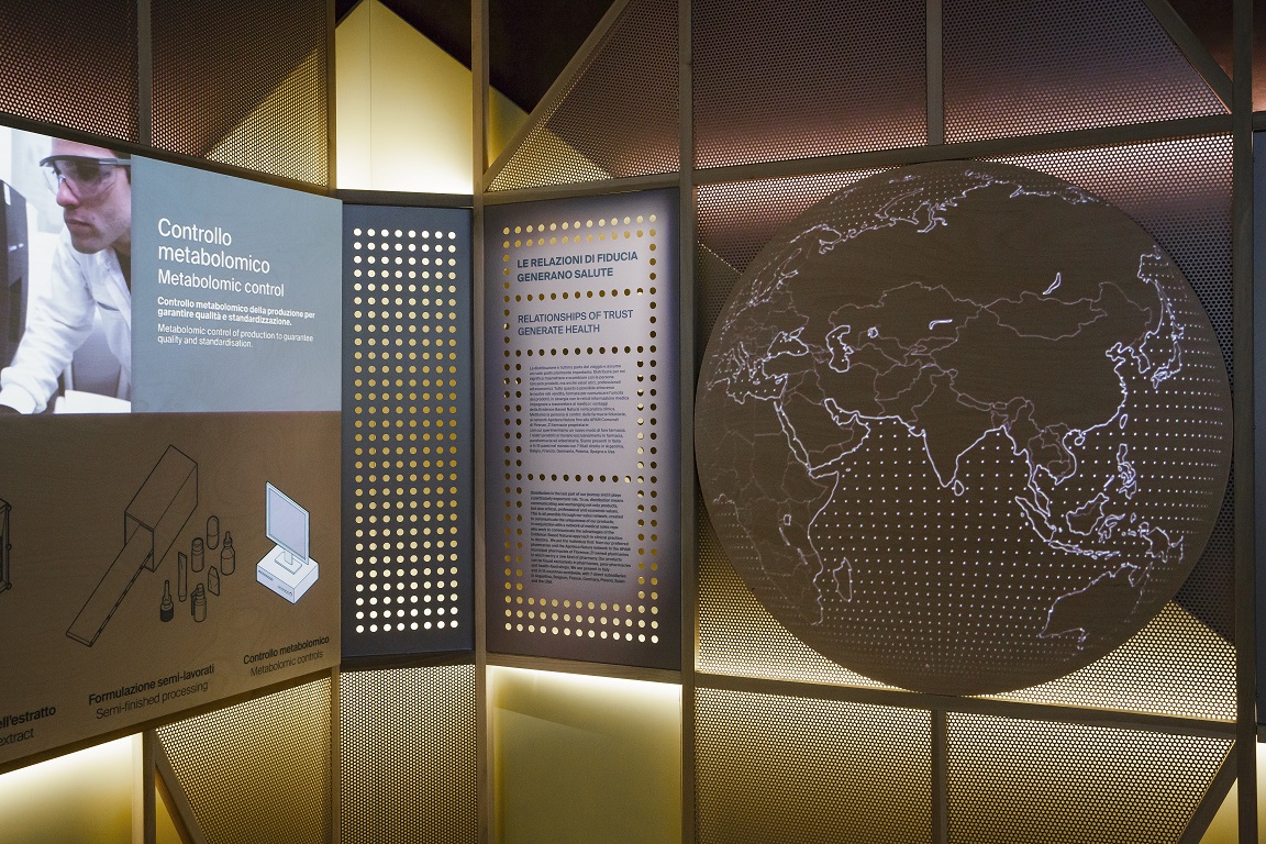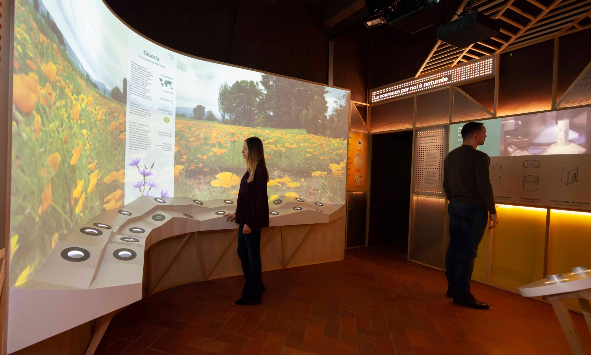 Lasciatevi trasportare dalle enormi proiezioni immersive: avvolti dalle coltivazioni impariamo il valore della biodiversità e le innumerevoli possibilità che la natura ci offre. Con una grafica animata, resa interattiva al tocco del visitatore, esploriamo il ciclo produttivo pensato per ottenere prodotti naturali al 100%, fisiologicamente affini con l’organismo. Un’installazione video descrive la filiera di distribuzione in Italia e all’estero.